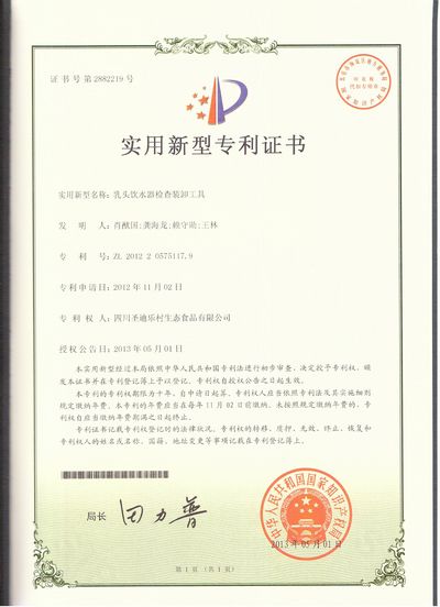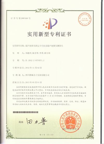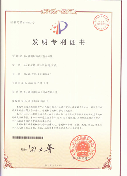 近日,鐵騎力士集團申請的又一發明專利《肉鴨飼料及其制備方法》獲得國家知識產權局正式授權,并頒發國家發明專利證書,專利號ZL200910258105.6。同時還獲得《超聲波探頭固定卡尺以及超聲波探頭測量尺》、《乳頭飲水器檢查裝卸工具》兩項實用新型專利,專利號ZL201220574571.2和ZL201220575117.9。