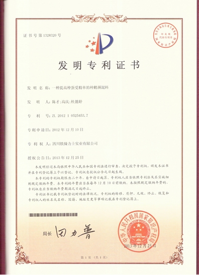 2月17日,由鐵騎力士集團馮光德實驗室申請的《一種提高種蛋受精率的種鵝預(yù)混料》獲得國家發(fā)明專利授權(quán),專利號為ZL201210525453.7。