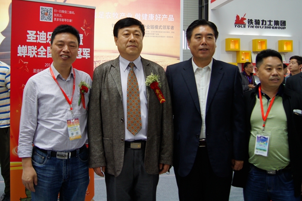 在隨后的巡館中,農業部副部長、首席獸醫師于康震、全國畜牧總站站長李希榮等行業領導專門來到鐵騎力士集團展位,了解集團的發展情況,并與總裁馮光德合影留念。