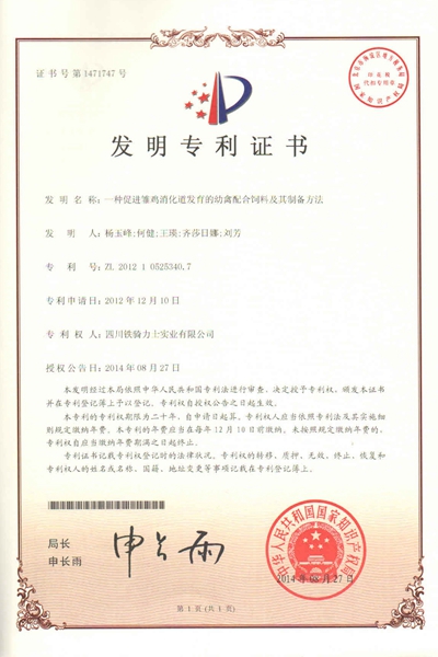 9月15日,由鐵騎力士集團馮光德實驗室申請的《一種促進雛雞消化道發育的幼禽配合飼料及其制備方法》獲得國家發明專利授權,專利號為ZL201210525340.7。這是集團今年以來獲得的第3項發明專利。