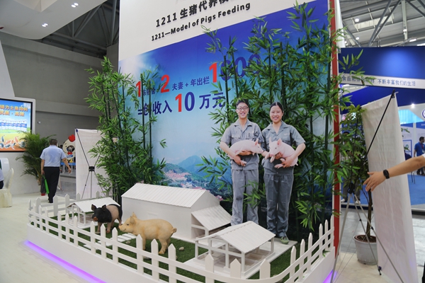 位于大企業(yè)大集團館的鐵騎力士展位占地180m2,以紅白兩色為基調(diào),分別展現(xiàn)了集團以飼料產(chǎn)業(yè)為基礎(chǔ),發(fā)展蛋雞、豬、鴨三大產(chǎn)業(yè)鏈,整個展臺設(shè)計高端大氣,景觀新穎,蛋形的圣迪樂村雞蛋展示臺別具一格,草坪上木質(zhì)的小屋溫馨可愛,里面活潑的雞苗、鴨苗吸引了不少客人駐足觀看,竹林掩映的豬舍邊,是抱著小豬的樂呵呵的養(yǎng)殖人員,大型噴繪背景上,1211生豬代養(yǎng)模式,“1棟豬舍+2夫妻+年出欄1000頭肥豬=純收入10萬元”的字體引人注目。