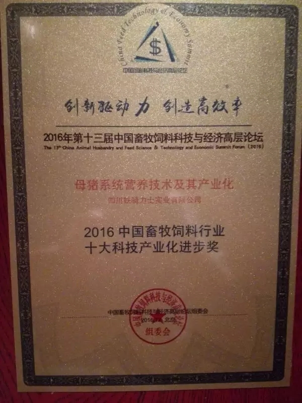 12月10日,“光榮與夢想”——2016中國畜牧飼料年度頒獎盛典在北京隆重舉行,鐵騎力士集團的“母豬系統營養技術及其產業化”項目榮獲2016中國畜牧飼料行業“十大科技產業化進步獎”。