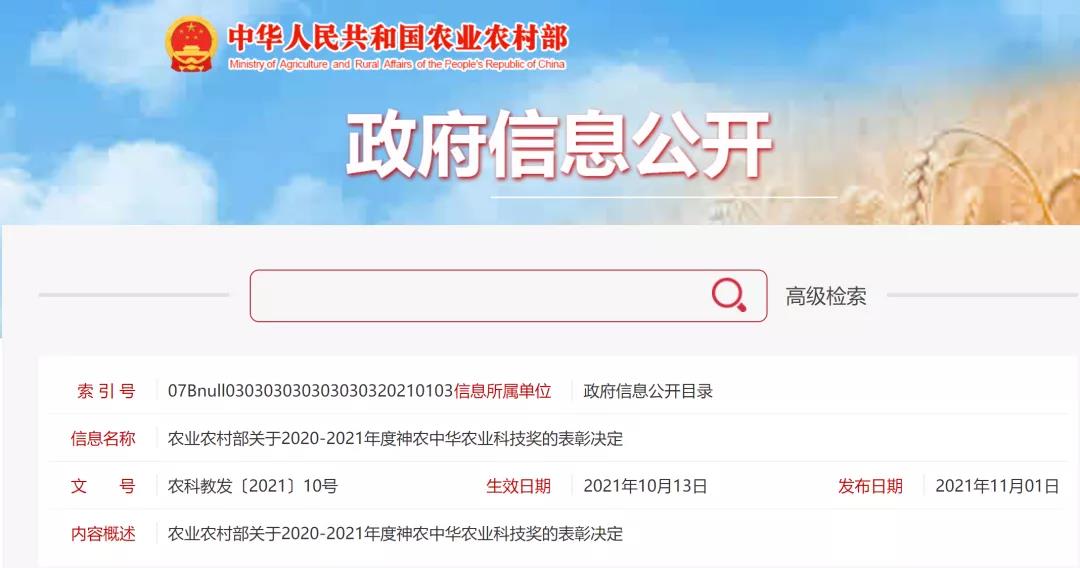 神農中華農業科技獎是由農業農村部、科技部批準設立的面向全國農業行業唯一綜合性農業科技獎,是原農業部科技進步獎的繼承和延伸,主要獎勵為我國農業科學技術進步和創新做出突出貢獻的集體和個人,其獲獎成果代表農業行業的科技發展水平。
