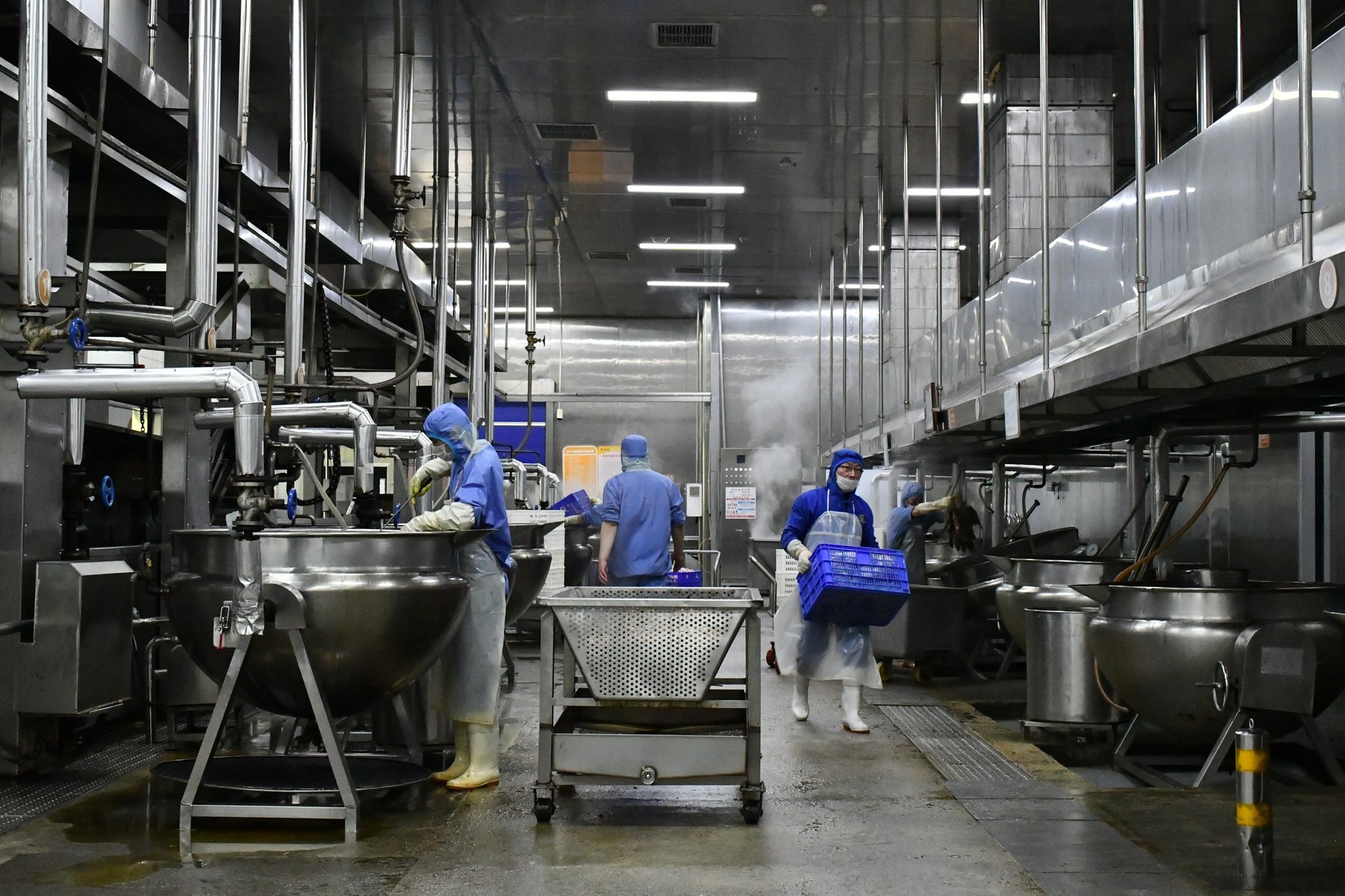 此時,鹵煮車間內的兩口大型鹵煮槽正敞開大口,白色的霧氣四下彌漫,褐色的鹵汁咕咚咕咚地在槽內翻滾,仿佛一只等待投喂的巨獸。
